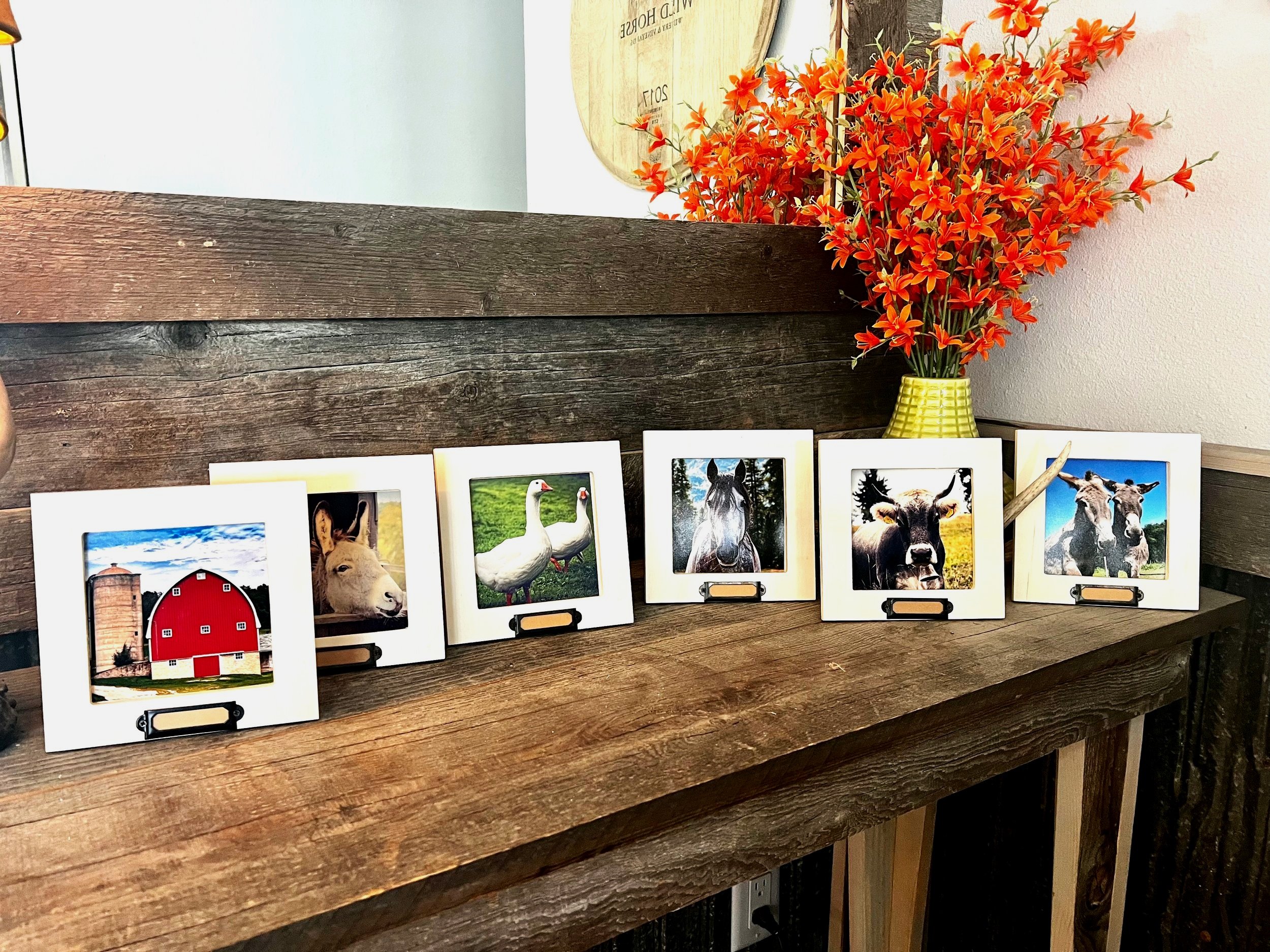 We like to put the pictures on a board and make a Ranch sign. We include double sided velcro so you can stick them on a board.